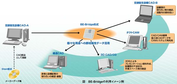 C-CADECでは、このような状況を踏まえ、異なるCADシステム間でも部材属性を伴ったCADデータの交換ができるように、BE-Bridge(ビーブリッジ:Building Equipment – Brief Integrated format for Data exchanGE)を開発しました。