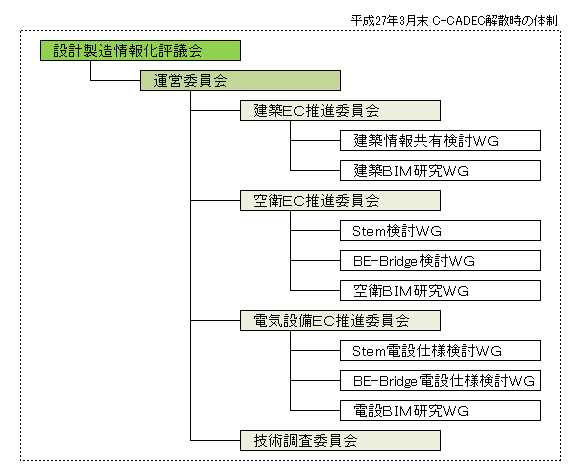 設計製造情報化評議会(C-CADEC)の元には、C-CADEC推進上の基本的な方針を審議する運営委員会が設置されていました。その下に4つの専門委員会、ならびに各委員会傘下にワーキンググループをそれぞれ設置され、建設産業の設計や製造にかかる情報を中心とする電子商取引の基盤整備および導入や普及のための推進活動を行っていました。