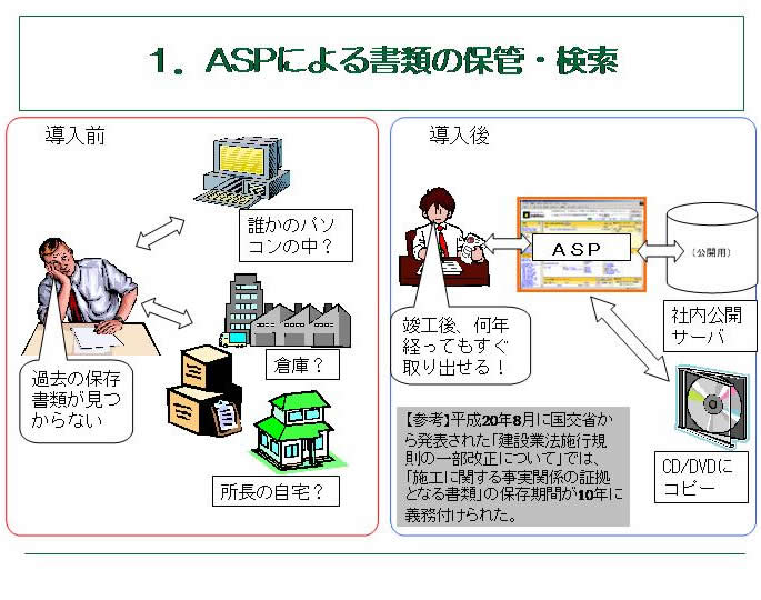 しかし、最近になってASPに2つの「追い風」が吹いてきました。その一つが、今年10月に国土交通省から発表された『「建設業法施行規則」の一部改正等について』 です。これによると、構造計算書偽造事件により失われた建築物の安全性に対する不信を解消するため、請負工事に関する営業書類の保存義務対象に、(1)完成図、(2)発注者との打ち合わせ記録、(3)施工体系図を追加するとともに、保存期間が10年間と定められました。改正建設業法が施行される今年11月28日以降に作成した書類は保存対象となります。元請責任の徹底の観点から、発注者から直接工事を請け負う元請業者が保存の義務を負います。