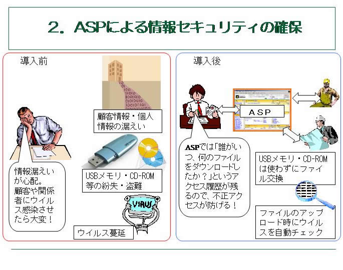 近年、USBメモリやCD-ROMに顧客情報等を持ち帰り、ファイル交換ソフトWinny等をインストールした私有のパソコンで仕事をしようとして情報漏えいが起きた事件が官公庁や民間企業で発生しています。もしASPを使えば、USBメモリやCD-ROMによるファイル授受は不要となります。(もちろん、最終的には業務を行う個人のモラルが最も重要なため、ASPだけで完全に情報漏えいを防ぐ事は難しいかも知れません。)