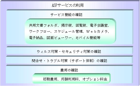 ASPサービスがどんなものか、どんな機能・サービスがあるのか、各プロバイダーでいろいろと紹介されています。自社が必要とする機能の有無とその機能内容の確認、他のプロバイダーとの比較も必要です。又、無料体験版のサービスを提供しているプロバイダーも多くあるので、その体験版を利用して実際に各機能が確認できます。