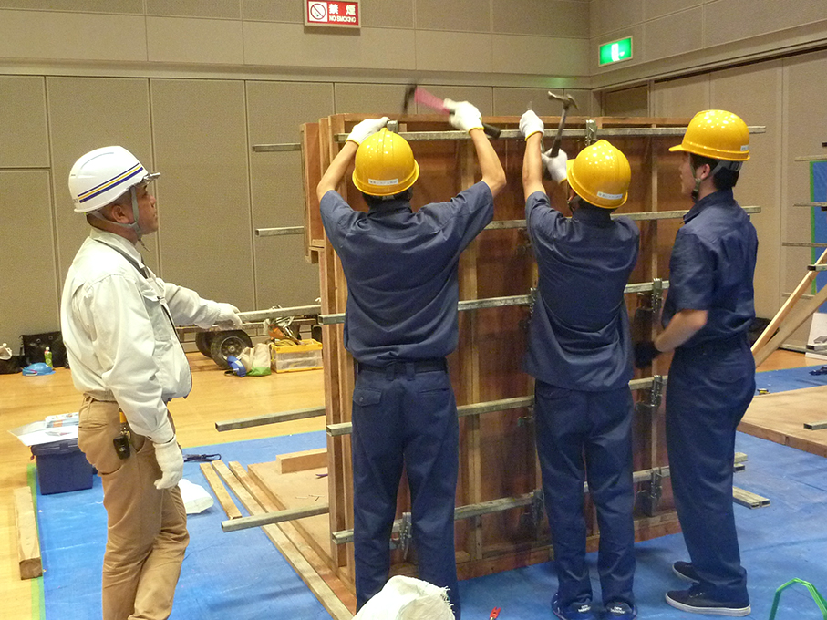 9:30から16:30までは、一つの会場を大きく2つのゾーンに分け、会場の両脇のゾーンでは名古屋市立工芸高等学校建築システム科の生徒40名による型枠・内装工事の実習体験を公開し、中央のゾーンでは専門工事業ごとに10種類のブースを用意し、各建設専門工事業についてブース来場者に説明いたしました。お昼の休憩時間を利用して実施したPRタイムでは、パワーポイントを使用したPRに手こずりながらも仕事のやりがいを語る建設専門工事業の方々の姿が新鮮でした。