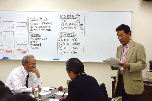 最初に自分の話を他人に伝える論理・技術を学び、なぜ伝わらないのか、伝わるためにはどうすればよいのかを理解した上で、実践として皆の前で発表を行う。発表の演習として例えば太陽熱利用システムの説明や吸排気の店舗設計、建設業の大臣認定の手続きの仕方など、受講者の専門分野を発表することを通じて、発表時間・声の出し方・笑顔等、他人に内容を伝えるための練習を全員で行った。